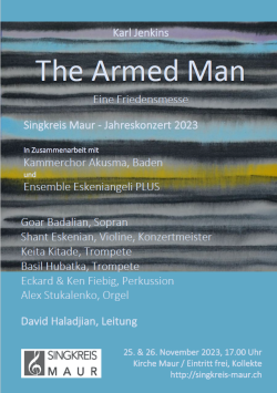 Die Friedensmesse «The Armed Man» entstand 1999 im Gedenken an die Opfer des Kosovo-Krieges. Karl Jenkins komponierte das Stück für vierstimmigen Chor und zwei Solisten auf Basis der Katholischen Messliturgie und anderen Quellen. Es zeigt den Schrecken des Krieges und endet mit der Hoffnung auf Frieden in einem neuen Jahrtausend, wenn Trauer, Schmerz und Tod überwunden werden können. (Wikipedia)