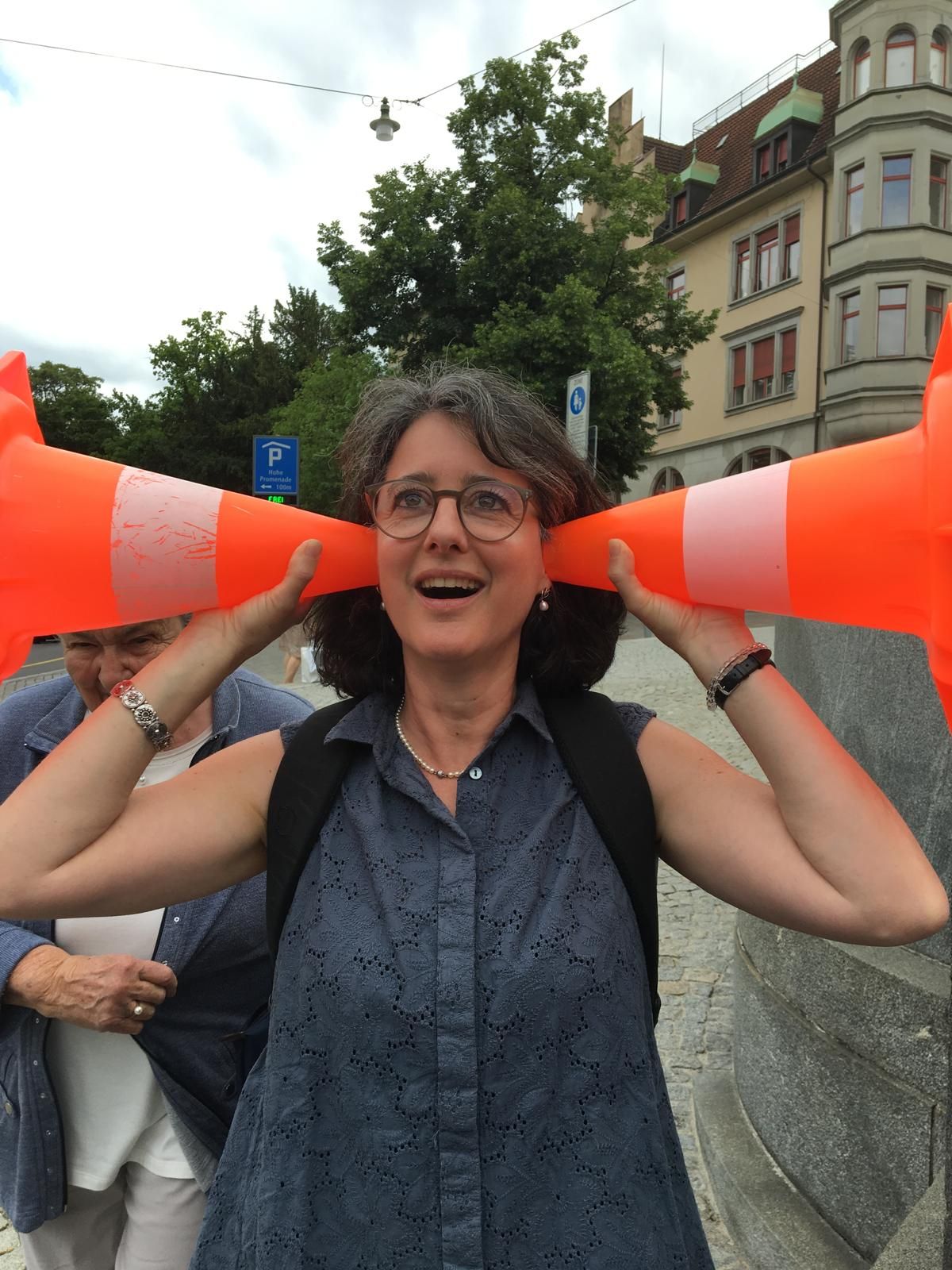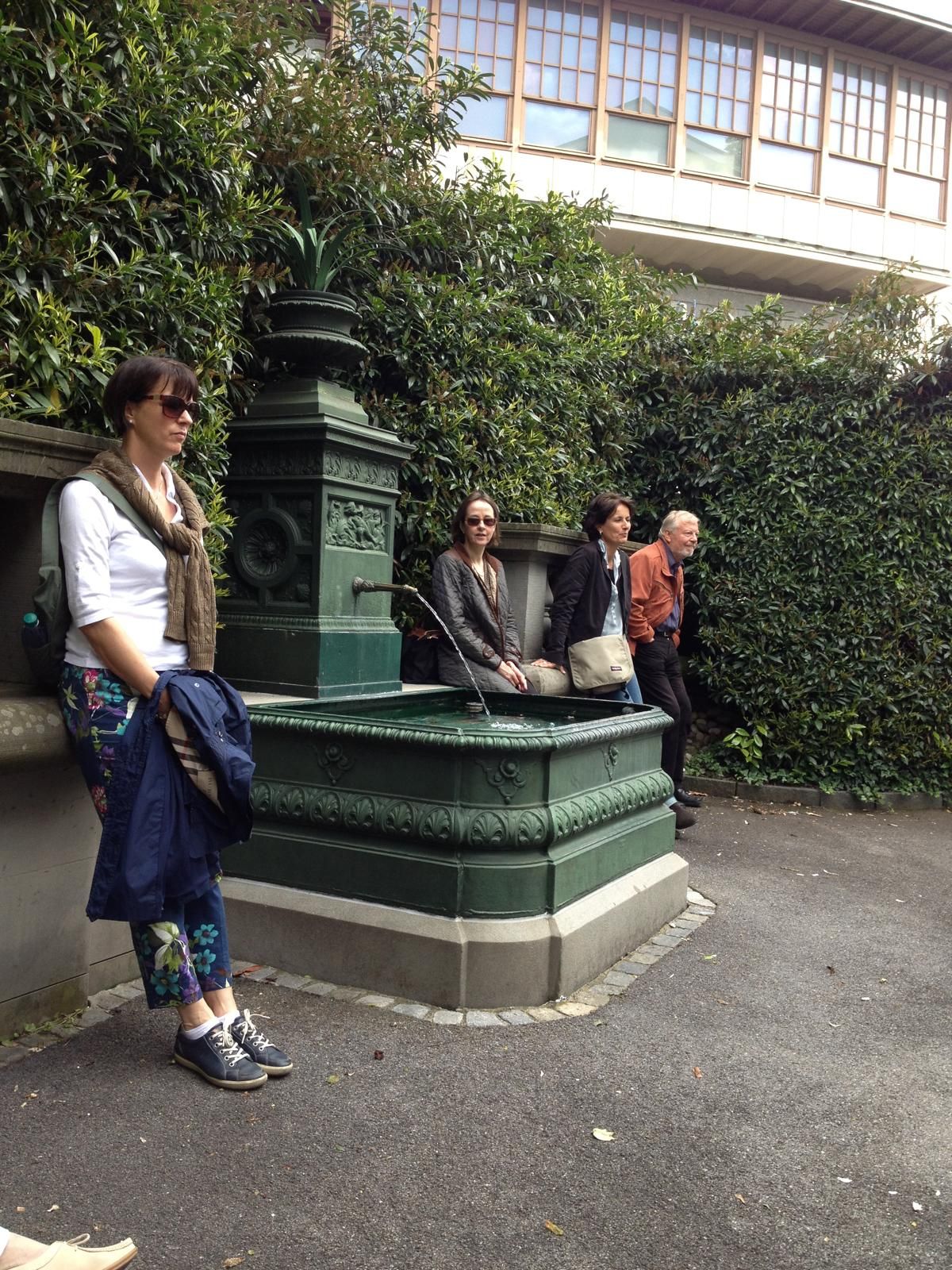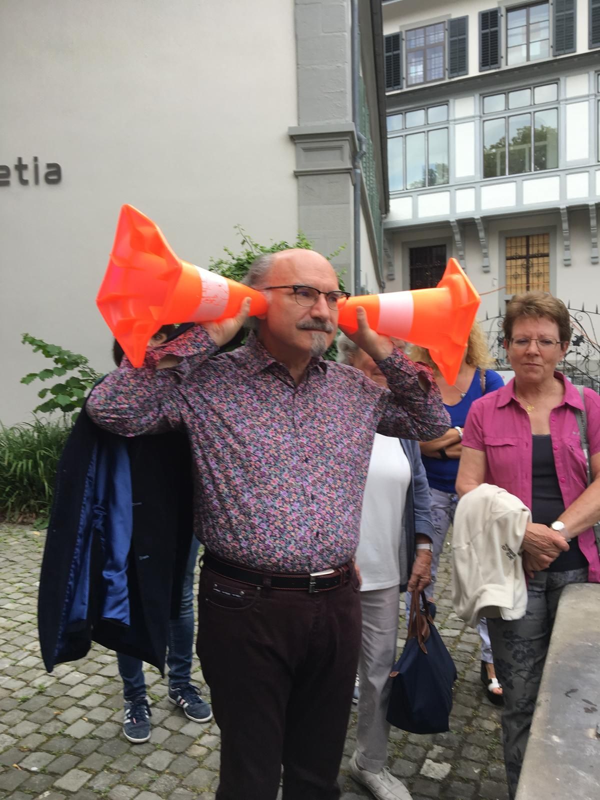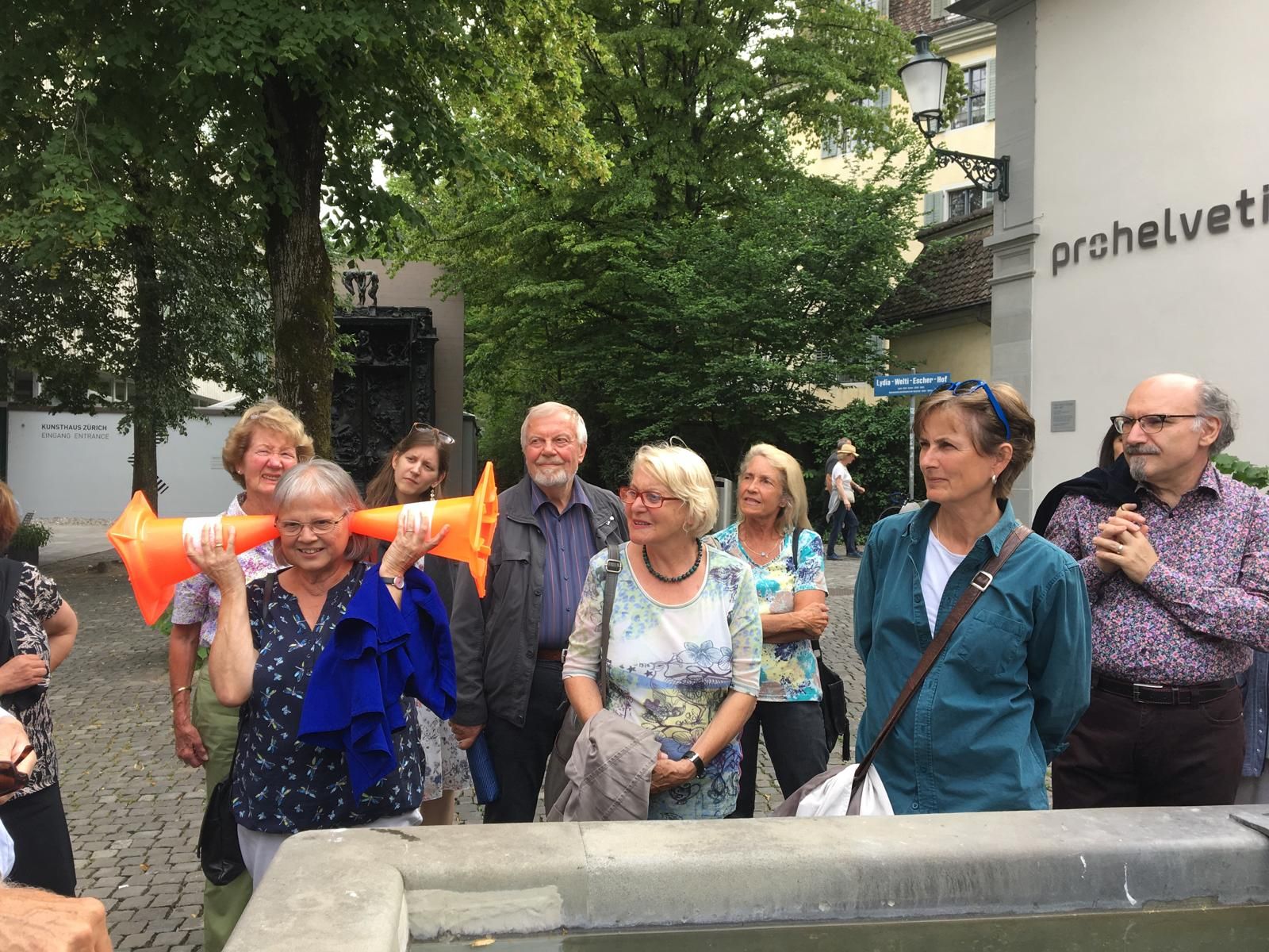Unter der Leitung von Andres Bosshard, einem Schweizer Musiker und Klangkünstler, spazierten wir durch die Altstadt von Zürich und ‘erhorchten’ uns die Stadt. Wir erlebten die Ruhe dicht über der Wasseroberoberfläche eines Brunnens, belauschten Gespräche aus weiter Entfernung durch Pylonen einer Baustelle oder genossen das beruhigende Gemurmel vor dem Grossmünster. So erlebt hatten wir die Stadt noch nie.
